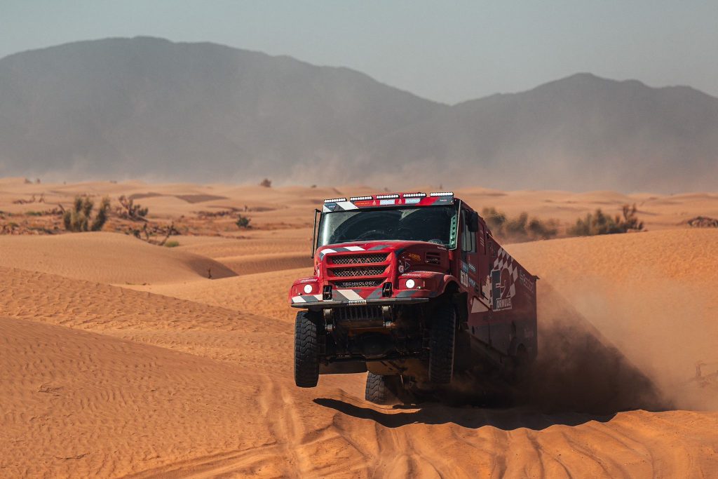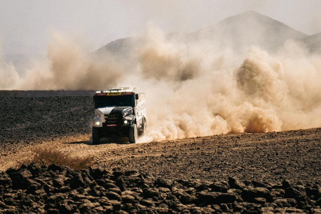 Kees Koolen: “We finishen als zesde truck nadat we 3 uren en 52 minuten deden over de proef van 327 km. De winnaar was 16 minuten sneller en in de scratch van alle auto’s, buggies en trucks waren we 46. Dat is een mooi uitgangspunt voor de start van de marathon etappe morgen. De proef vandaag was nagenoeg alleen maar stenen en veel stof. 20km was erg los zand maar doordat dat vol lag met grote en scherpe stenen moesten we de banden hard laten. Helaas al na 20km hadden we een lekke band. De rest van de proef ging goed en we hebben veel mensen kunnen passeren.”