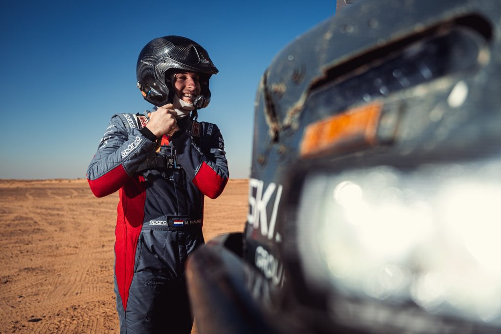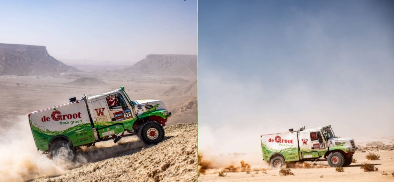 Peter Willemsen namens Mitchel van den Brink: “Er is geen bereik vanuit het bivak. We begonnen goed en dat hielden we vol. De etappe verliep volgens plan. Een dagzege is leuk, maar nu hadden we besloten om te proberen kort achter Loprais te eindigen. In de etappe van morgen starten wij dan achter hem en kunnen proberen naar hem toe te rijden. Dat is vaak makkelijker dan de proef te moeten openen.”