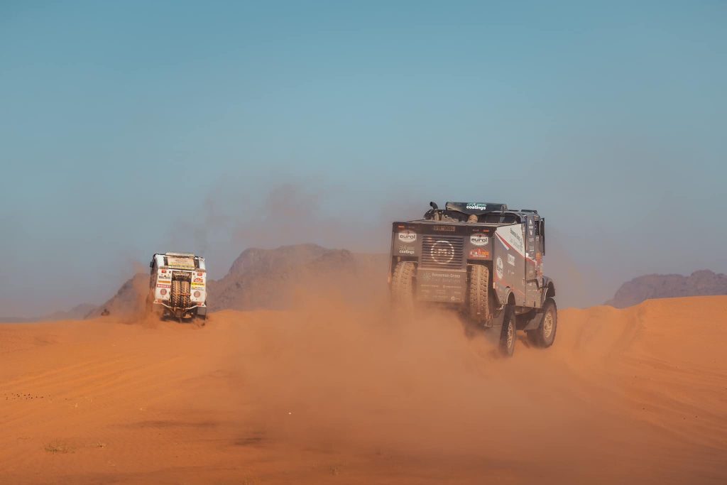 In bivak C (op km 546) vinden we de koplopers van het veld. Drie Iveco’s, één door Matin Macik gebouwd, twee door Corné van Drunen en zijn mensen bij De Rooy. Er is maar één Nederlander ter plekke van de truckers, maar Max van Grol, de boordmonteur van Zala (3e), kan (de momenten dat hij niet sleutelt) natuurlijk Nederlands praten met mannen uit de personenwagencategorie, zoals oud De Rooy coryfee Marcel Snijders, die samen met coureur Maik Willems in dat bivak aan is gekomen. En dan hebben we natuurlijk nog Darek Rodewald, de boordmonteur van Loprais (2e), die inmiddels beter Brabants spreekt dan de gemiddelde inwoner van Helmond.