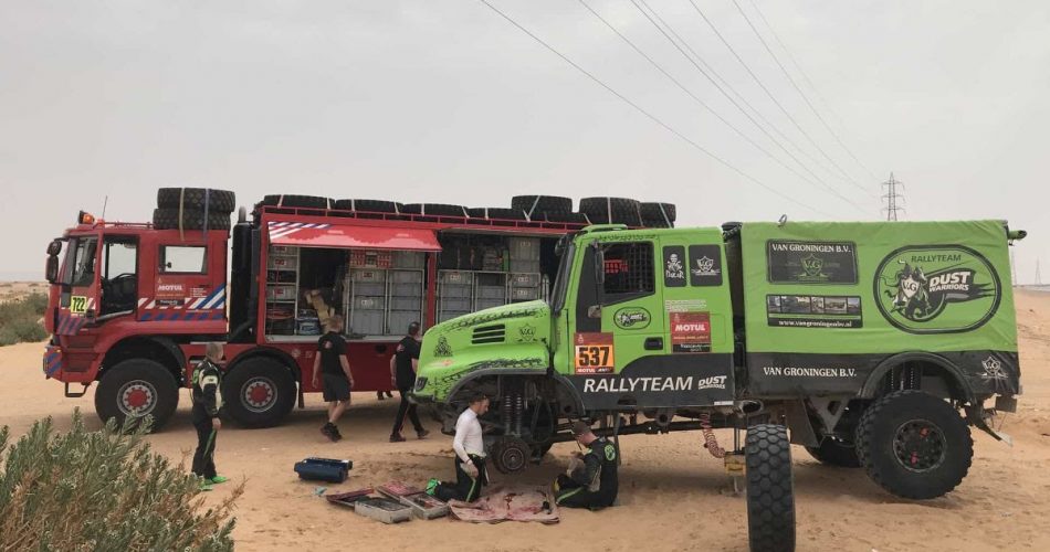 Bij de Dust Warriors vandaag ook weer een flink avontuur. Corné van Drunen: “William (die heen en weer reed tussen bivak en Koot, red.) had geen problemen, we hebben vóór de start Koot service verleend omdat die vannacht niet in het bivak is geweest.” Op het moment van schrijven zijn de beide trucks nog onderweg. We hadden ook nog beloofd op het avontuur van het team in etappe 5 terug te komen. William van Groningen afgelopen nacht via whatsapp: “Vanochtend weer op pad, met de DAF en Iveco samen onderweg naar de start. Loopt onderweg naar de start een wiellager vast in de naaf, dus weer aan de kant en repareren met hulp van het Firemen team. Daardoor waren we een uur te laat bij de start, waarop we gediskwalificeerd waren voor het rijden in de Dakar. Maar !!!Met hulp van Corné, specialist monteur van de Rooy, die alles heeft gedaan om ons toch weer te laten starten , super blij mee en Corne is nu hoofd communicatie geworden bij ons team !!!!!!! En de DAF die rijd nu nog steeds in de duinen en zal over 2 /3 uur waarschijnlijk binnen komen als alles goed gaat”
