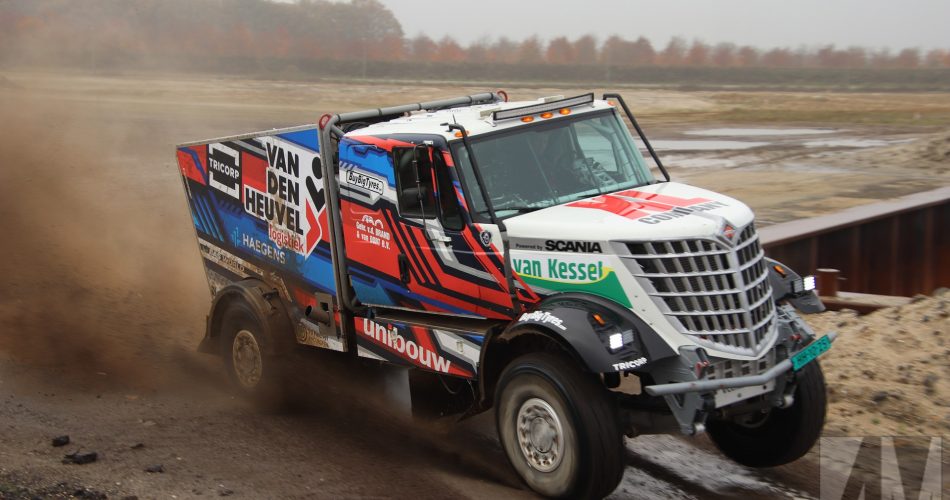 Het blijft een kwestie van smaak, maar wij vinden het een waanzinnig mooie en brute truck. Maurik van den Heuvel wilde iets aparts en dat is gelukt: De International-Scania DKR-3! Sportief succes in de afgelopen Dakar rally bleef helaas uit na een onfortuinlijke crash. Onboardbeelden die het team online plaatste waren spectaculair, maar voor het team en bemanning natuurlijk dramatisch. Weg sportieve aspiraties en een stevige streep door de letterlijke en figuurlijke rekening. De DKR-3 moest opnieuw worden opgebouwd. De cabine werd afgeschreven, maar het chassis had de dubbele flikflak met salto (hoge score van de jury) wonderwel goed doorstaan. Dat was een meevaller voor oppermonteur Martijn van Rooij en z’n technische dienst in Uden. Voor de zomer was de International-Scania weer klaar en werd er in de Baja van Aragon getest. Na die test moest het veerpakket worden vervangen en dat gebeurde in Tsjechië bij MM Technology van Martin Macík en zoon. Het chassis komt daar vandaan en de truck kreeg naast het nieuwe veerpakket meteen andere updates mee. Nu staat de truck er weer piekfijn bij en de equipe van Maurik heeft zin in een nieuw avontuur. Het gaspedaal zal weer stevig worden ingedrukt. Hopelijk komt het team nu zonder keerscheuren door de zwaartste rally ter wereld heen. In potentie is het een topauto waarmee een klassering bij de eerste 10 rallytrucks zeker haalbaar moet zijn, al lijkt het daar ieder jaar drukker te worden.
