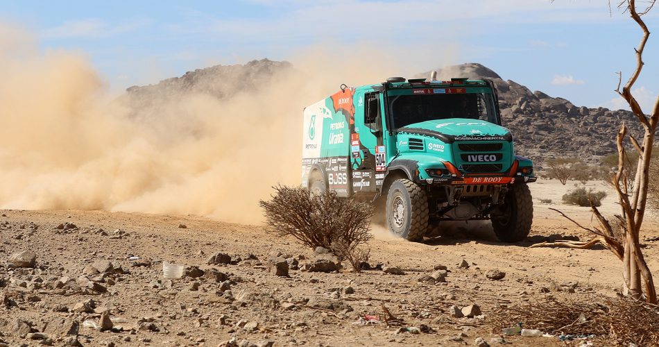 Daar waar we ooit het merk DAF noemde, is dat nu vooral Iveco geworden. Zo rijdt Kees Koolen in een door MM Technology (Marin Macik) ontwikkelde Iveco. Koolen heeft zelfs twee dagen gereden om de truck beter te leren kennen. Hij is super te vreden en er is niks bijzonders naar voren gekomen. Omdat de truck nieuw voor hem is, heeft Koolen veel kilometers gereden om te wennen aan het rijden in een rallytruck. De vorige keer is toch al weer tien jaar geleden. Koolen: “Op de eerste dag ging het lekker, maar het echte gevoel van eenheid met de truck was er nog niet. Vandaag ging het vanaf ronde 5 echt lekker en zijn we thuis in en met de truck.” Hij is zeer tevreden over de Iveco: “De truck is in één woord ‘geweldig’! Alles tot in de puntjes afgewerkt, maar ook zaken als vering en het remmen met de retarder zijn van een ongekend niveau.” Aldus de Vordense rallyrijder.