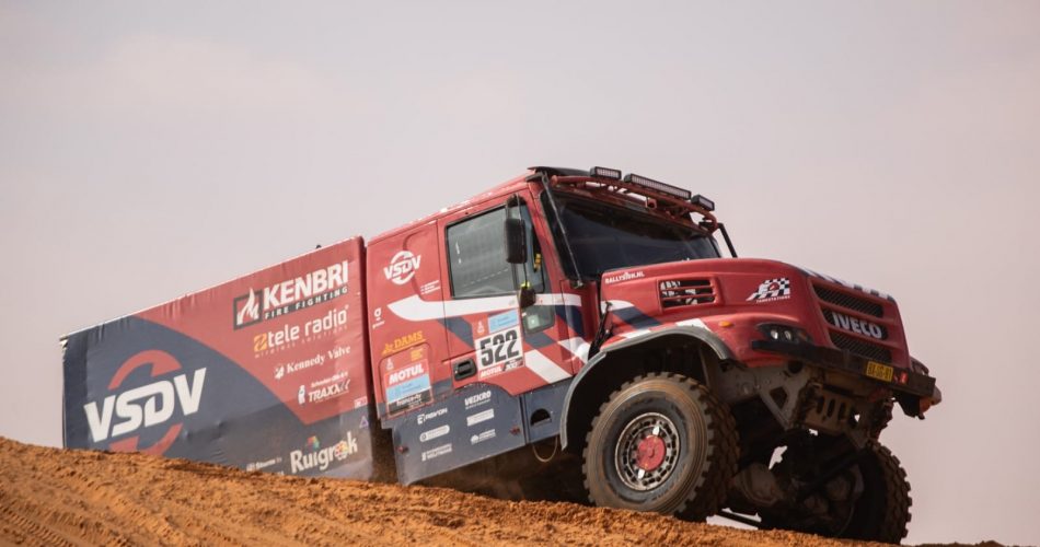 Kees Koolen: “Dit is “a day at the office” voor Gijs tijdens deze Dakar. Tijdens de proef verandert hij bijvoorbeeld continue de bandenspanning. Als voorbeeld: In de duinen rijden we meestal 2,2 of 2,5 bar. Als het erg los is 1.5 bar en als we vast zitten even 1,0. Maar met 1,0 kun je alleen maar langzaam rijden. Op snelle stukken rijden we 2,8 3,2 3,5 en soms 3,8 bar. Hoe meer stenen op het pad hoe harder.”