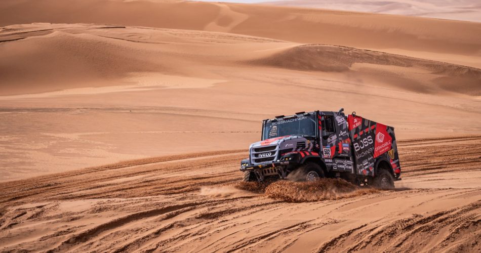 Nadat de dag begon met een verbinding van 108 kilometer mocht de Iveco Powerstar met startnummer 502 als zesde truck aan de special stage beginnen. Er stond een gevarieerd parcours op het menu en de recente regenval maakte het verraderlijk. Een goede dagklassering voor Janus van Kasteren jr., Marcel Snijders en Darek Rodewald leek in het begin niet voor het oprapen. Janus doet zijn verhaal: “De dag begon eigenlijk dramatisch. We hadden na 10 kilometer in de duinen een band eraf liggen, dus die moesten we wisselen. Dat was echt jammer en daar baalde ik gruwelijk van. Tot bij kilometer 100 denk ik, ongeveer. Daar was één hele grote rivier. Ik denk zo’n 800 meter breed. Darek heeft meteen de bandenspanning heel goed laag gezet. Er plankgas doorheen, beetje aan de rechtse kant. Ik heb die 800 meter niks gezien, alleen maar gas gegeven. We draaien er links uit en we rijden 500 meter verder en zien Martin (van den Brink – red.) en Macik links vaststaan in het water. We zijn omgedraaid om bij Martin te kijken of we konden helpen, maar we reden bijna zelf vast. Dat was dus geen optie. Toen zijn we verder gereden.”