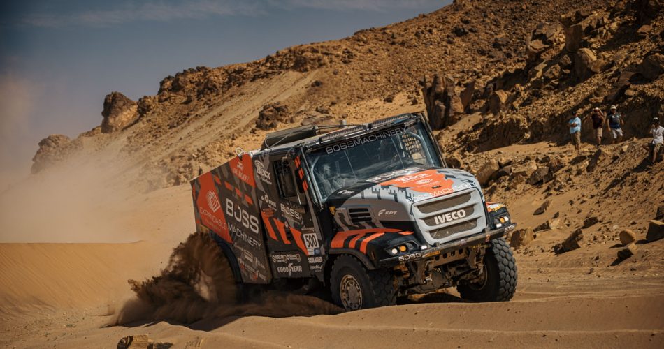 En wie het laatst lacht lacht het best. Na de ontzettende baaldag van gisteren ging het vandaag gelukkig een stuk beter met Janus van Kasteren, Marcel Snijders en Darek Rodewald. Zo werden de mannen van Boss Machinery Team De Rooy FPT winnaar van de tweede etappe. Het spraakbericht wat we ontvingen was dan ook een stuk opgewekter dan die van gisteren: “Vandaag wel een lekker dagje. Eerste stuk was stenen, stenen en nog eens stenen. Eigenlijk hebben we vandaag alles gehad wat je in een Dakar tegenkomt: Stenen, zwaar zand en duinen. Prima duinen. Ging goed. De eerste vijftig kilometer was het vooral een beetje uitkijken voor de banden. Belangrijk om die wat te sparen in dat deel. Daarna, na de neutralisatie, waren het paden door drooggevallen rivierbeddingen met heel zwaar zand. De motor had het daar zwaar. Die werd erg warm, net als de banden. Je moet dan met twee bar rijden en de temperatuur liep daardoor flink op. Vervolgens kwamen best wel hoge duinen. Daar hebben we vier trucks ingehaald. Op het einde zaten er nog wat snelle paden in. Het was echt wel een mooie dag om te rijden.” Aldus Van Kasteren. De 296 kilometer lange proef van vandaag werd door de equipe met startnummer 500 in 3:30:26u afgelegd. Martin Macik werd op iets meer dan zes minuten tweede. De Let Pascavicius werd derde op een kwartier van dagwinnaar Van Kasteren.