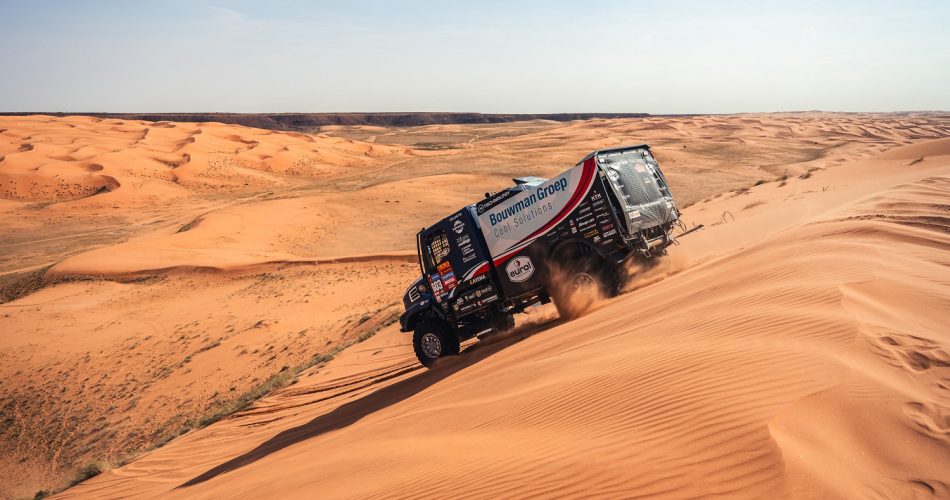 Saskia Winkelman: “Het was een mooie dag vandaag tijdens etappe 8. De proef bestond uit twee delen, opgesplitst door een neutralisatie van 200 kilometer. Deel 1 stond in het teken van duinen in allerlei soorten en maten: snel, hoog, scherp, noem maar op. Het was een glooiend parcours met een paar mooie steile afdalingen. Ondanks dat ze door de late binnenkomst van gisteren ver achteraan moesten starten konden ze onderweg veel buggies en andere vrachtwagens inhalen, mede ook doordat ze weinig last hadden van stof. In de duinen hebben ze door pienter navigatiewerk van Edwin een paar keer de juiste paden gekozen, waardoor ze meerdere andere voertuigen te snel af waren. Na de neutralisatie zaten ze in de omgeving van Hail, waar de laatste 110 kilometer van de proef verreden werd, met veel stenen en snelle paden. De grote hoeveelheid stof bemoeilijkte het inhalen behoorlijk. Ze kwamen ook veel wadi’s tegen met scherpe stenen, waardoor je meteen op eieren rijdt om maar niets kapot te rijden. Ondanks die goede intenties ging het op 15 kilometer voor de streep toch mis, waardoor er even een band gewisseld moest worden. Dat betekende ook weer meer stof, omdat ze ingehaald werden door voertuigen die ze net zelf ingehaald hadden. Desondanks een prima dagje: als 8ste binnen, en in het algemeen klassement de 6de plek geconsolideerd en zelfs uitgelopen op de nummer 7. Michiel voelt zich goed, Edwin navigeert lekker, en Wuf heeft technisch alles onder controle. Een lekker dagje voor het team!”