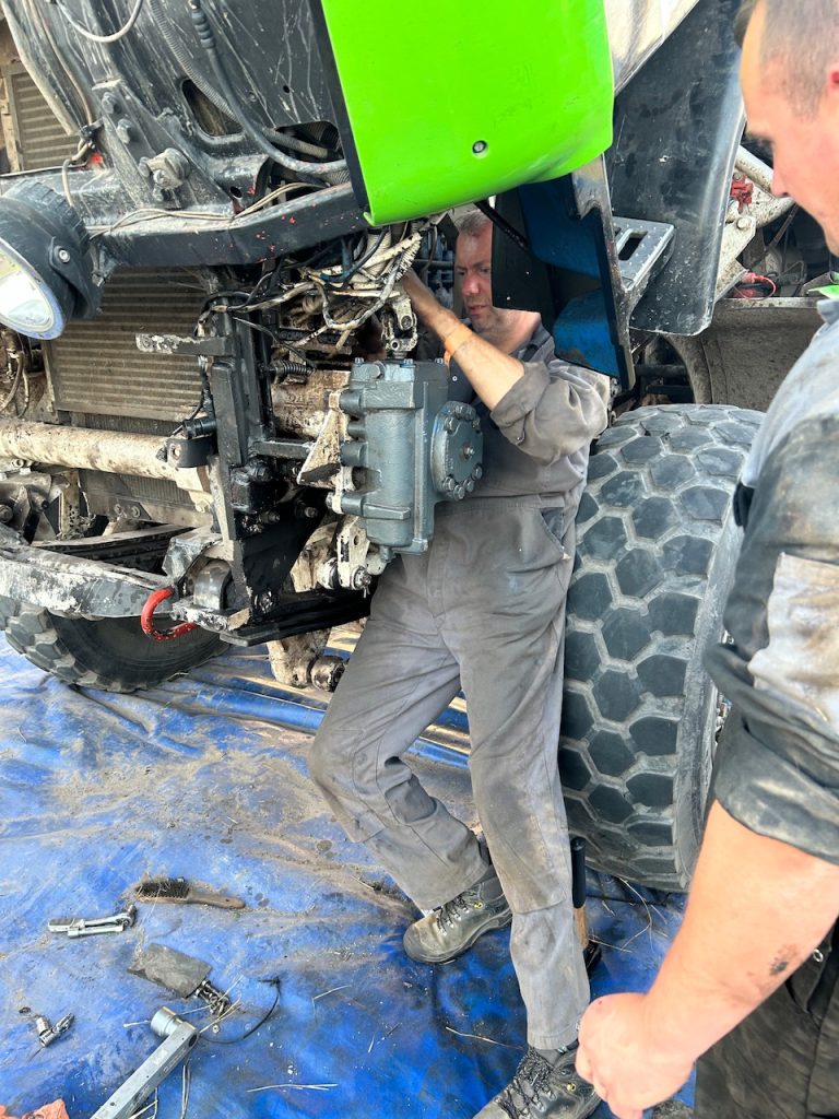 Hans van der Sanden, Rob Hoeks en Ruud Jansen zijn vandaag de eerste truck van het FVDS Rally Team die we in de uitslagen terugzien. De Ginaf VMD2208 is een truck die oorspronkelijk gemaakt is voor de Extreme Klasse door het VMD team. Toen dit team stopte werd de truck overgenomen door wat nu FVDS is. Die naam staat voor Fiers Van Der Sande. Vandaag mag het even VDSF heten, want Fiers kwam met een kapotte stuurpomp te zitten en moest dus hels stuurwerk verrichten om zonder bekrachtiging aan de finish te komen. Dat lukte wel, maar de gezichten stonden op somber. Het team moest op zoek naar een andere stuurpomp om zo de Ginaf X2223 te kunnen repareren. Hugo Kupper rijdt in een vrijwel identieke truck en schoot te hulp.