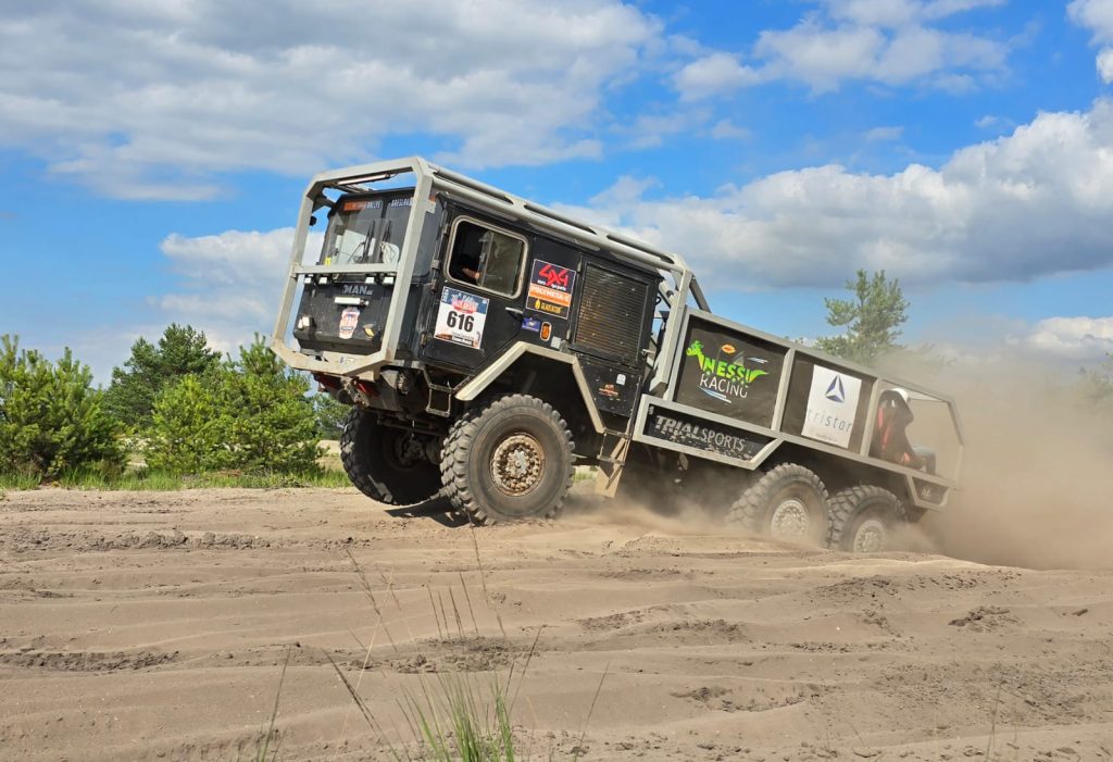 Vader en zoon De Graaf vermaken zich prima bij hun debuut in de MAN Kat. Zoon Daniël doet verslag: Het ging goed. De route was alleen goed stuk gereden. Veel korte bultjes na de bochten. Hier heeft onze truck wat moeite mee in verband met de originele schokbrekers die er nu nog onder zitten. Voor volgend jaar komen er 8 Fox dempers onder. Op de helft heb ik het stuur van pa overgenomen. Ging top. bruut door dat mulle zand. Die 600pk Deutz motor is helemaal in zijn nopjes hier. Benieuwd wat de rest van de week ons gaat brengen.” Team De Graaf draagt de rode lantaarn, maar het avontuur is er duidelijk niet minder om.