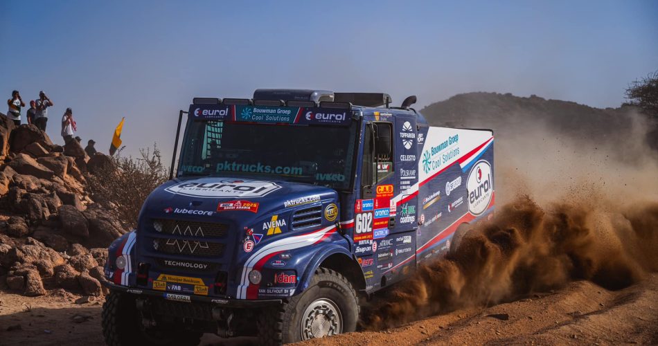 Navigator Jan van der Vaet doet uitgebreid verslag: “Na bijna een week hier dan nu eindelijk de proloog. Het is een supertruck, kan ook niet anders, het is de winnaar van vorig jaar. We hebben de proloog op 80% gereden en geen gekke dingen gedaan. Hier en daar een paar seconden verloren. Er zat een achtste plaats in, maar elfde is zeker goed om morgen de etappe te doen. Die etappe bestaat uit drie delen. Eerst een stuk snel, dan een deel minder snel met veel stenen, het derde deel opnieuw snelle pistes en wadi’s. Een heel mooie proef met een klein beetje navigeren. De sfeer is goed, het team is goed. Vroeg slapen, morgen om 9:15 gaan we aan de gang, om eerst de verbindingsroute te doen van 86 kilometer naar de special.