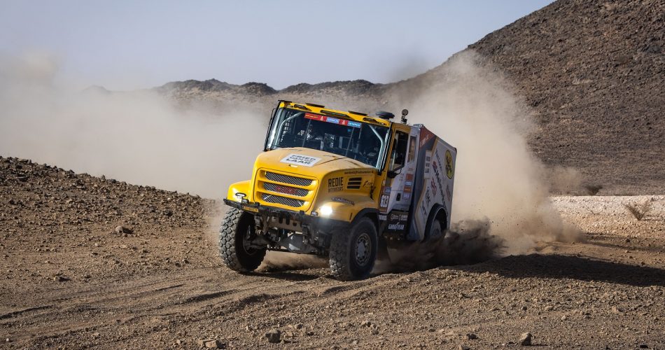 Kees Koolen: “We finishen als zesde truck nadat we 3 uren en 52 minuten deden over de proef van 327 km. De winnaar was 16 minuten sneller en in de scratch van alle auto’s, buggies en trucks waren we 46. Dat is een mooi uitgangspunt voor de start van de marathon etappe morgen. De proef vandaag was nagenoeg alleen maar stenen en veel stof. 20km was erg los zand maar doordat dat vol lag met grote en scherpe stenen moesten we de banden hard laten. Helaas al na 20km hadden we een lekke band. De rest van de proef ging goed en we hebben veel mensen kunnen passeren.”