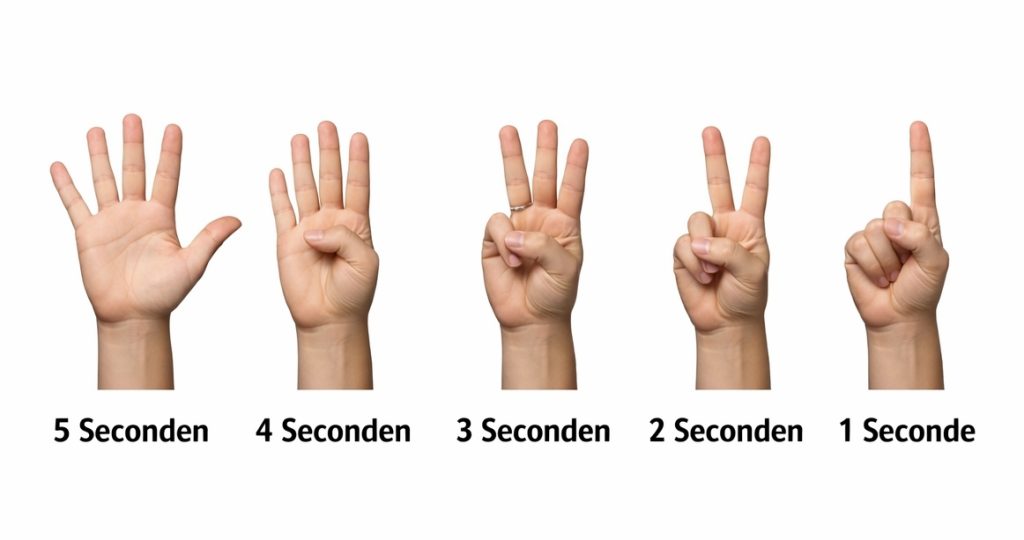 - 5 seconden: Vijf vingers gespreid omhoog (handpalm naar voren).