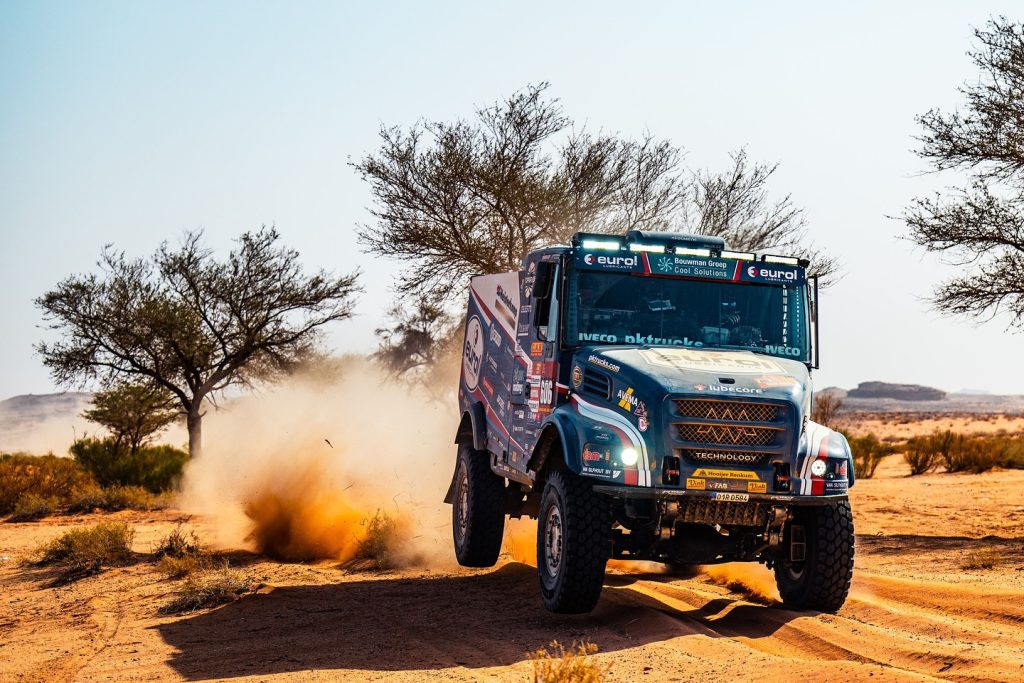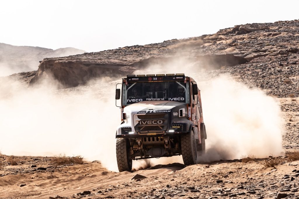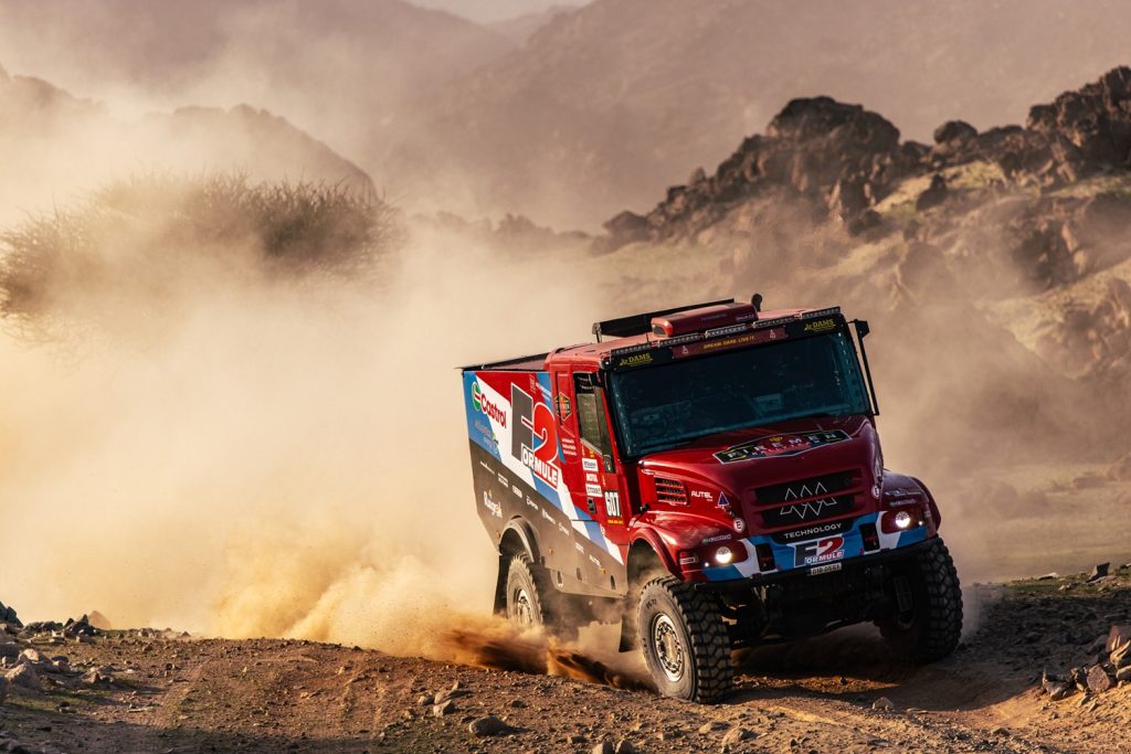 Een spannend gevecht aan de kop vandaag. De beide Iveco’s van De Rooy, met Loprais en Zala achter de respectievelijke stuurtjes, vochten samen met Mitchel van den Brink om de overwinning. Uiteindelijk was het Loprais die won. Er zal morgen op de rustdag in het bivak dus nog een extra alcohol-vrije pivo gedronken worden tijdens zijn verjaardagsfeestje. Mitchel kwam zevenkwart minuut tekort, maar moest door een minuut straftijd genoeg nemen met het laagste podiumschavot. Zala werd tweede op net geen twee minuten. Achter het podiumgevecht was nóg een mooie strijd te zien. Macik verloor veel tijd, daarmee de kop in het klassement teruggevend aan Mitchel en werd zesde op 46 minuten en 39 seconden achter Loprais. Kay Huzink, als tweede vlak achter Macik gestart, heeft hem de hele dag niet uit het vizier verloren en toen de coffeeshophouder uit Praag in de slotfase in de problemen kwam, stak hij hem mooi voorbij. Huzink werd uiteindelijk vijfde op 45 minuten en 56 seconden. De Firemen deden weer leuk voorin mee, lagen lang zesde, maar werden met een eindsprint uiteindelijk heel knap vierde, op 43 minuten en zes seconden.
