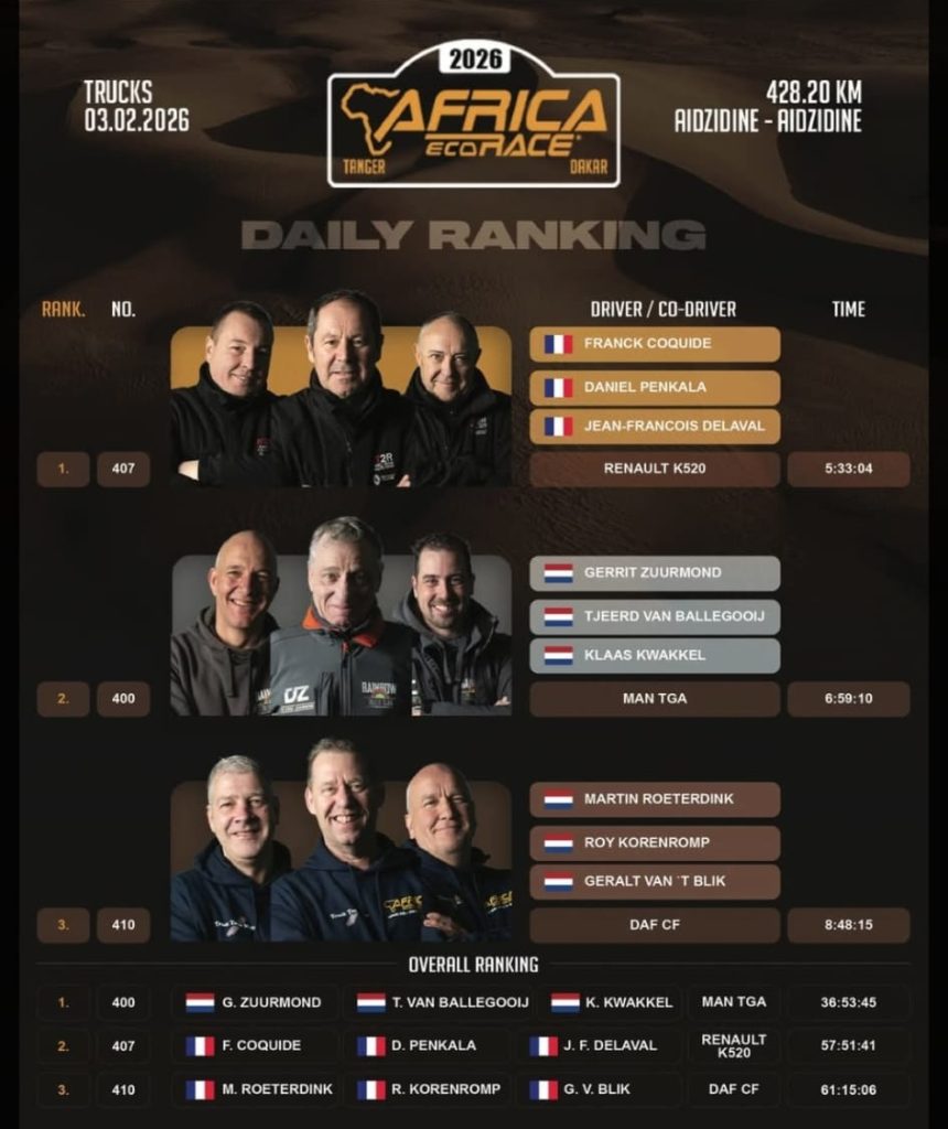 Jullie zien het, Coquide stond gisteren als etappe-winnaar te boek. Hoe hij de onoverwinnelijk geachte Zuurmond anderhalf uur voor kon blijven? Heel simpel, door een ‘stukje’ af te steken. Zowel de start als finish waren gisteren bij het bivak in Aidzidine. Direct na de start stonden onze Franse vrienden echter al aan de kant met de sierlijke Renault. Ze zijn terug gereden naar het bivak, daar is uren lang aan de truck gesleuteld. Daarna is mijn onder de finish door gereden, die immers ook vlak bij het bivak is. Tsja. Natuurlijk komt er straftijd bij, maar het was even vreemd opkijken voor Martin Roeterdink, Roy Korenromp en Geralt van ’t Blik toen ze de timing tabel openden om trots hun verwachtte tweede plek met de fans te delen.