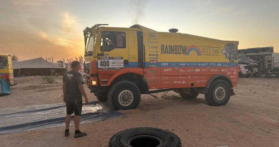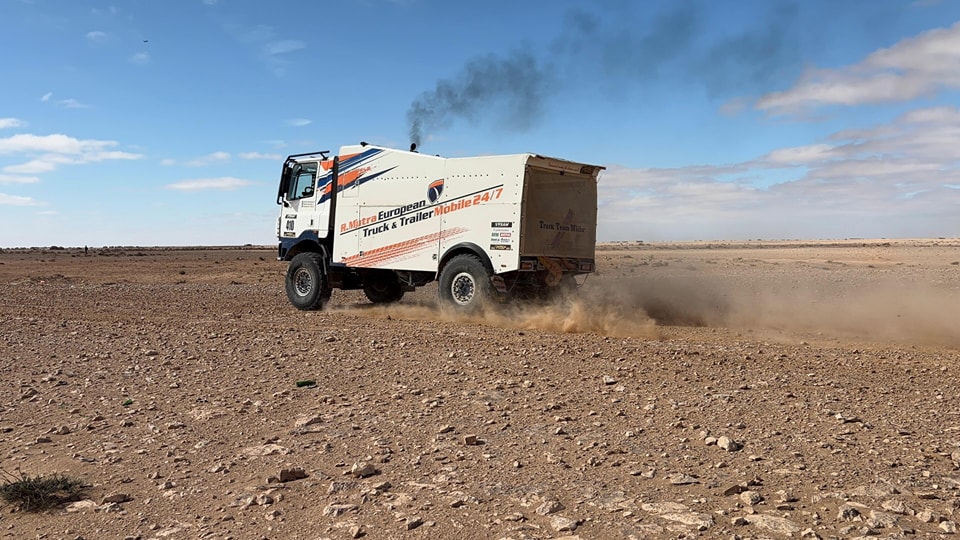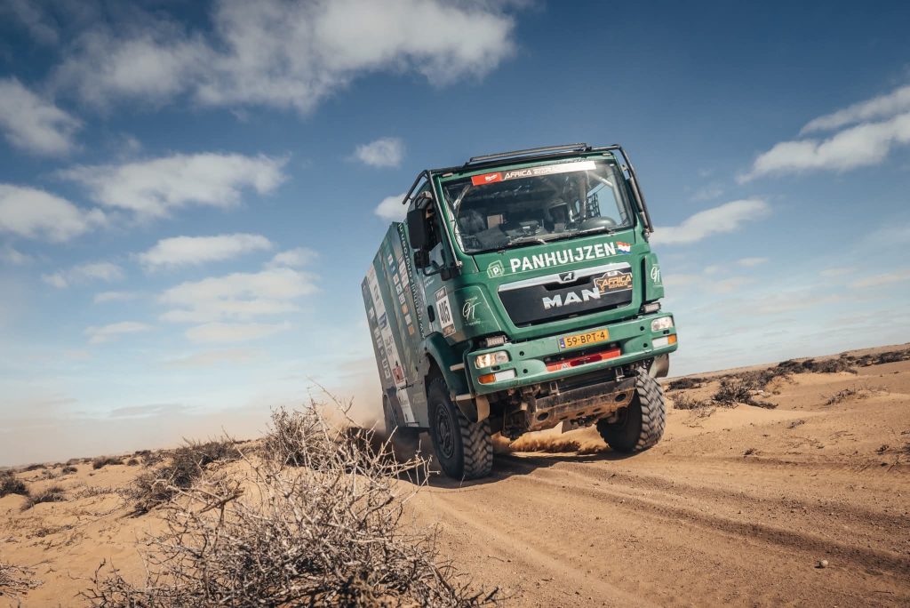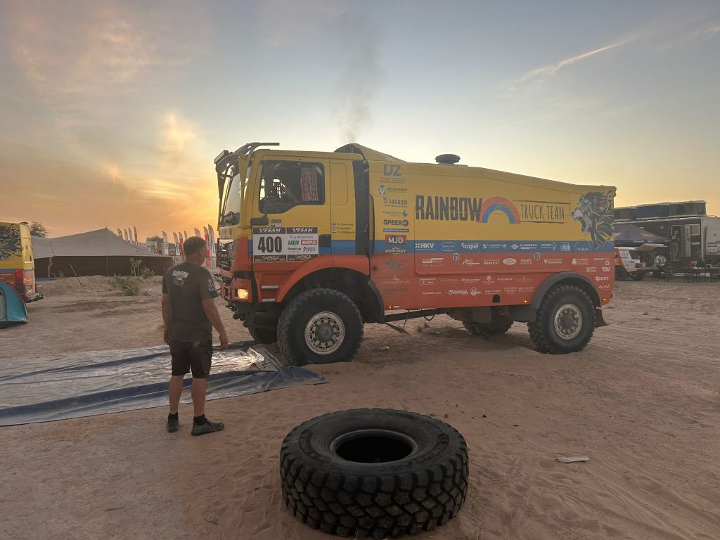 Bij Truck Team Müller geen probleemloze dag. Roy Korenromp: “De eerste 85 km tot de duinen ging snel. Geralt merkte al snel dat het banden aflaatsysteem niet goed werkte. Bij de duinen zijn we gestopt en hebben de banden handmatig afgelaten. We begonnen aan de eerste duin en klapten er over heen en op dat moment kreeg Geralt last van de rug. We zijn gelijk gestopt en toen geralt bij gekomen was, hebben we de keuze gemaakt om de proef maar niet af te maken en maar via de snelste weg naar het bivouac te rijden. Panhuizen was net voorbij ons de duinen in gereden en stond vast. De Fransen kwamen er ook aan en we gaven door dat we terug gingen rijden. De Fransen reden richting Mike en daarna hoorde ik hun truck ook niet meer. Ik ben de duinen in gelopen om te kijken hoe de situatie was. En door dat mulle zand is 1 km best ver en zwaar. Toen ik aan kwam waren ze beide net los en ze probeerden beide om de duinen heen te rijden. Wij zochten een pad richting de grote weg, maar dat was ook nog bijna 40 km. We reden richting Akjoujt en dachten daar op de zuidelijke rondweg uit te komen. Hij was mooi breed maar er reed niemand en aan het eind kwamen we bij de vuilnisbelt uit. Op Google maps bleek dat we op de landingsbaan reden! We reden naar het bivouac, dropten Geralt en reden nog even door naar de finish voor de waypoints.”Foto Truck Team Müller