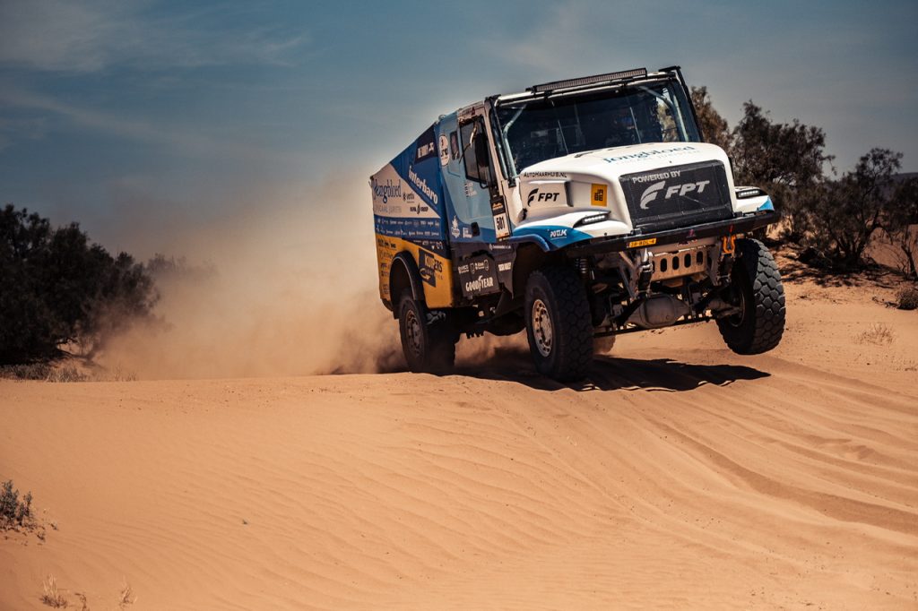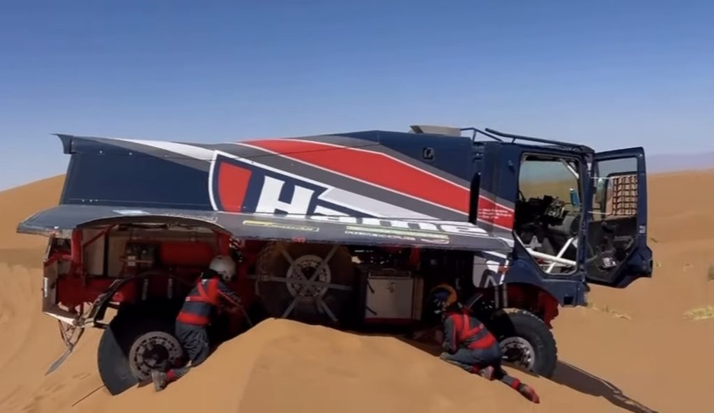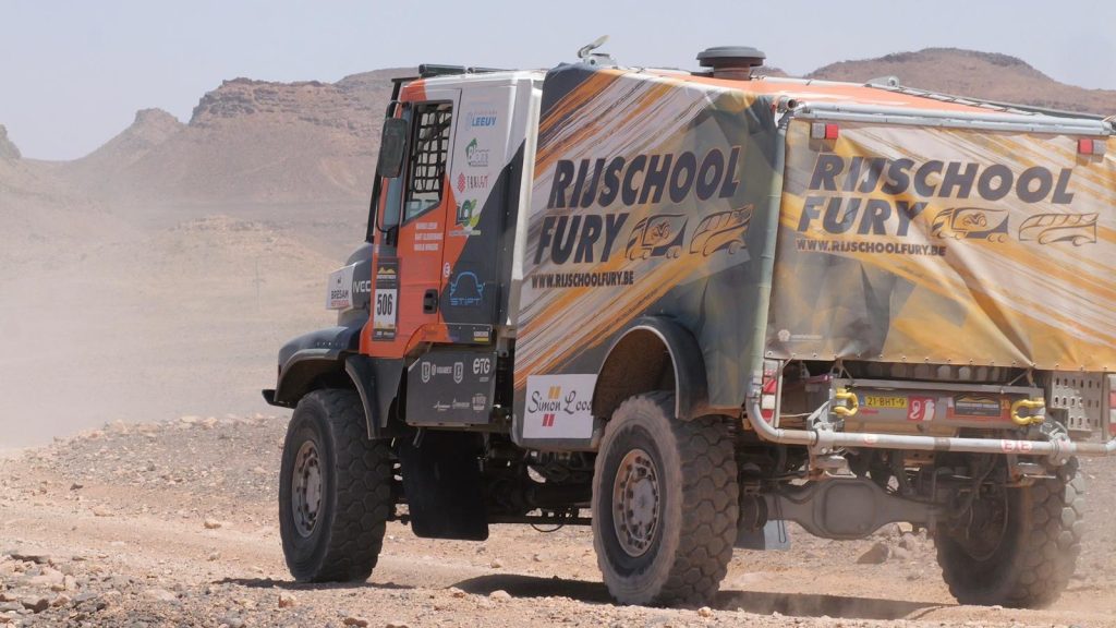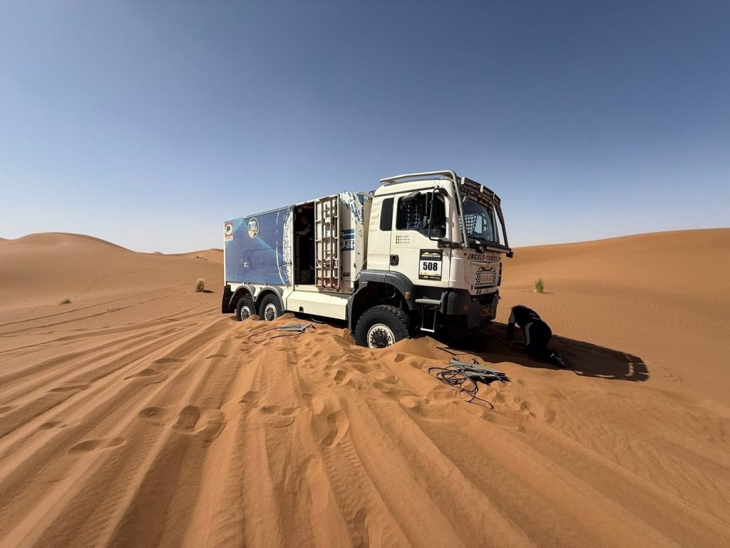 Waar de familie van Groningen de derde etappe snel willen vergeten door de mechanische tegenslag, ging het voor de 6×6 van de familie Ingels ook niet vanzelf. Steve, Victor en Arthur kwamen in de duinen vast te staan met de zware MAN. Dat betekende scheppen, scheppen en nog eens scheppen. En dat bij 37 graden in een uitgestrekt duinengebied met enkel schaduw van de eigen truck. Verder heeft de truck zich goed gehouden en het positieve van het verhaal is dat de familie Ingels door de ellende bij familie Van Groningen wel een plekkje zijn gestegen in het klassement. Je moet je toch aan iets vasthouden, dus gaan onze Belgische vol overgave verder met hun avontuur.